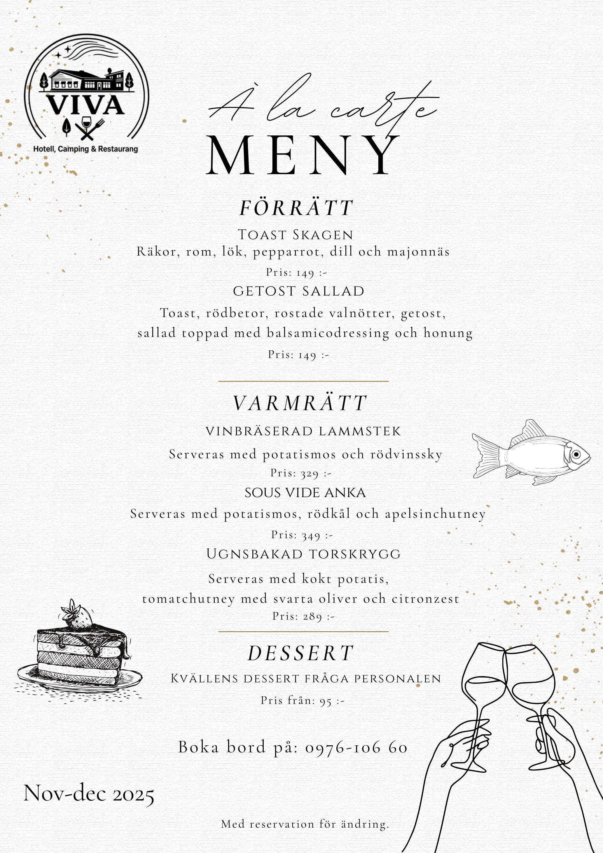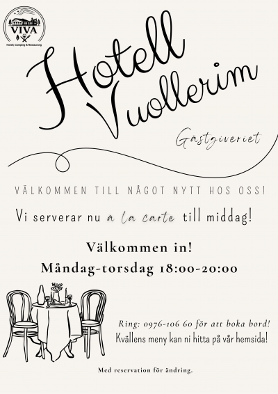 NYHET! Nu finns även möjlighet beställa kvällsmat från vår Meny a la carte, vardagar måndag till och med torsdag 18.00-20.00! För bästa möjliga service, boka i förväg - ring 0976-10660 eller maila info@hotellvuollerim.se